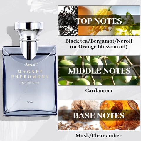 Biancat™ Magnet Pheromone Men Perfume utilizes a unique fragrance formula combined with ion-binding technology to enhance the scent and efficacy of pheromones. Emit a distinctive bodily aroma, where its fragrance molecules stimulate the olfactory nerves, assisting you in attracting and seducing women more effectively.